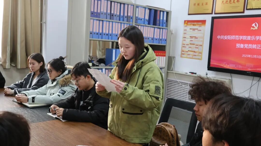 学生第一党支部王思琦同志郑重宣读转正申请书,全面汇报预备期内思想、学习、工作表现及不足,明确改进方向并宣读转正后的期望与承诺。