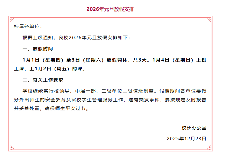 1月1日(星期四)至3日(星期六)放假调休,共3天。1月4日(星期日)上班上课,上1月2日(周五)的课。