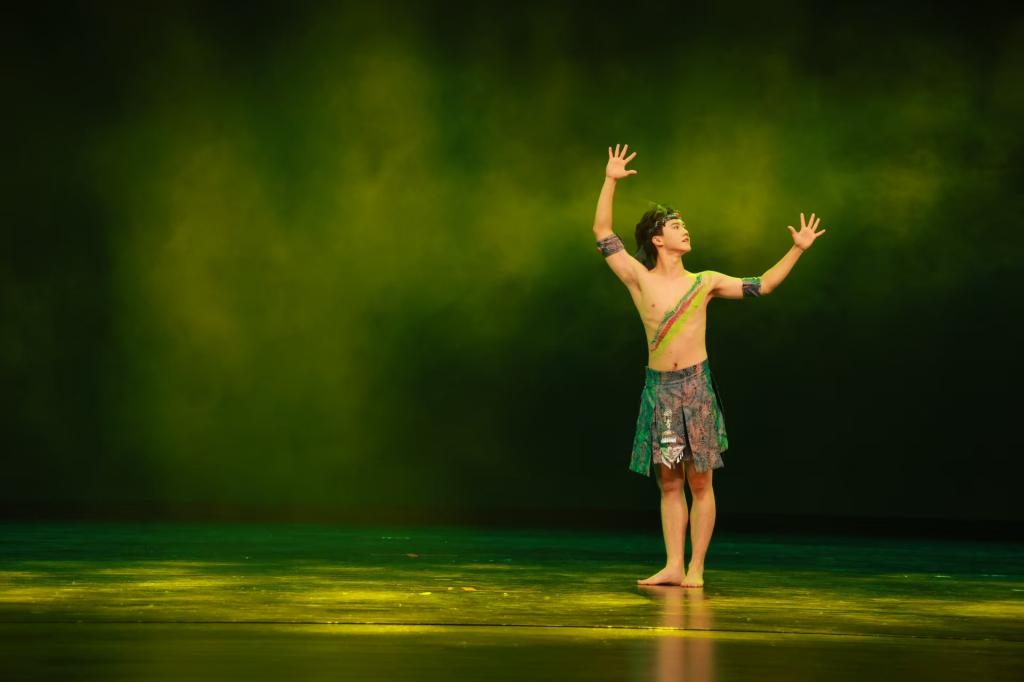 独舞舞台上更是精品云集、星光闪耀。《暗夜曙光》堪称高光之作,舞者一人一舞台,用极具张力的肢体语言诉说着冲破阴霾、追寻光明的故事。《萨吾尔登礼赞》以国家级非遗为蓝本,将蒙古族舞蹈的舒展与深情演绎得淋漓尽致,让传统文化在当代舞台焕发活力;《澜水见月圆》如月光下的流水温柔缱绻,《傣语悠悠》似竹影中的清风灵动俏皮,一南一北的舞姿勾勒出中华大地的多样风情;《丝路》用舒展舞步串联文明交流脉络,《东归》以激昂律动诉说民族回归赤诚。《狼吟》以强烈的情感张力震撼全场,以刚劲有力的动作展现生命的野性与坚韧。《美丽的阿依汗》《红棉红》《吉祥树》则洋溢着向上的生命力,或展现民族风情的鲜活,或歌颂信仰的炽热,或传递吉祥的祈愿。《天外玄音》《家燕归巢》更是将想象与乡愁融入舞姿,让观众在虚实之间感受艺术的无限可能。
