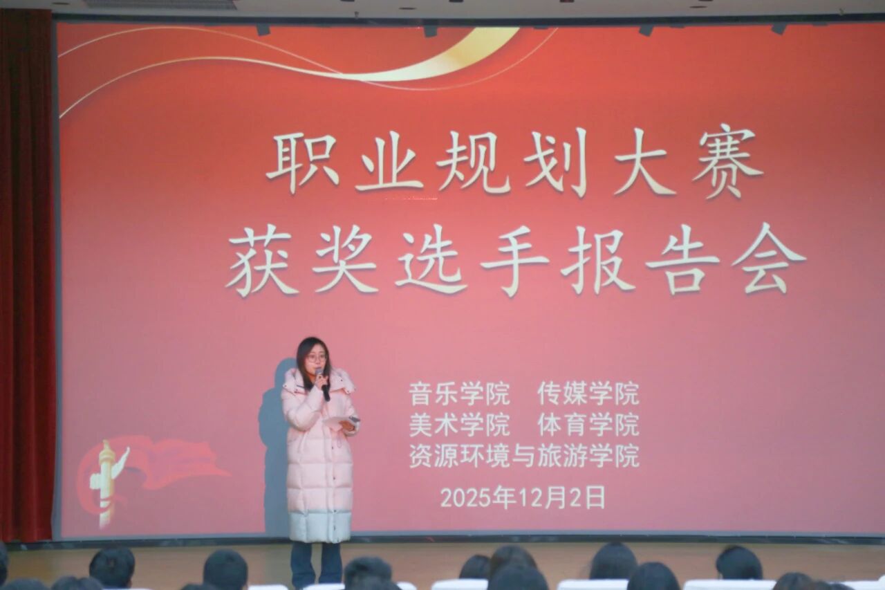 为发挥朋辈引领作用,帮助同学们深化对职业规划大赛的认知,提升职业生涯规划能力。12月2日,由我院牵头,联合传媒学院、美术学院、体育学院、资源环境与旅游学院共同举办的职业规划大赛获奖选手报告会在传媒学院举行。五个学院师生代表参会,报告会由我院辅导员徐尚主持。