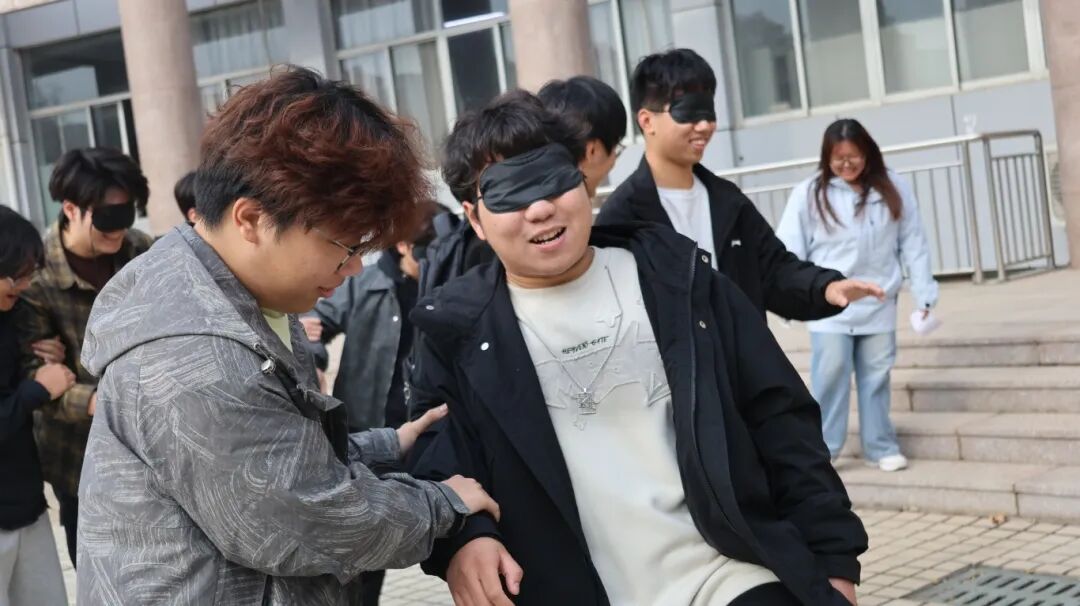 “残障”体验区里,学生们两两结合,共同闯过铁丝路障。蒙上双眼在指定路线行走时的迷茫,让学生们深刻体会到残障人士的不易。